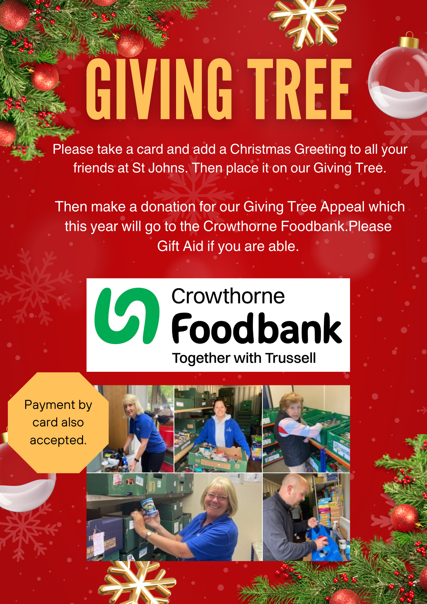 Hang it on the Giving Tree in the Vestibule at Church and then make a donation for our Giving Tree Appeal which this year will go to Crowthorne Foodbank. Please Gift Aid if you are able. You can click on the link below to make a donation and also use the card machine at Church.